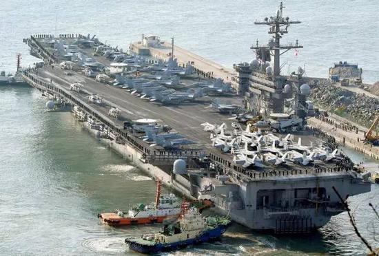 4月9日,美国“卡尔文森”航母打击群离开新加坡,北上韩国水域巡航。近期美三航母或会师半岛海域。据韩媒报道,美国“卡尔·文森”号航母战斗群已于14日抵达朝鲜半岛东南公海海域。事实上,未来几个月在朝鲜半岛海域出没的,绝不仅仅只有“卡尔·文森”号航母。准航母级的“美国”号两栖攻击舰也正在前往韩国的途中。 此外,另一艘母港位于美国西海岸的航母——“尼米兹”号目前正在加紧进行编队合同训练——在完成既定的训练项目后,也将在接下来的几个月出港,横跨太平洋。也就是说,未来几个月,在朝鲜半岛周边海域,有可能出现双航母、甚至三航母同时出现的情形。