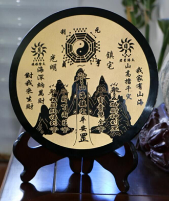 山海镇材质为黑水晶,黑水晶能消除负性能量,排除不良浊气,避邪化煞、吸收病气。此山海镇正中央画八卦太极图,南北各安日与月,中间画三山五岳,四周是五湖四海。山海镇具有移山排海,将煞气完全排除,颠倒阴阳之功效。所以在风水化煞上应用非常广泛,面对各种形式煞都有奇特效果。