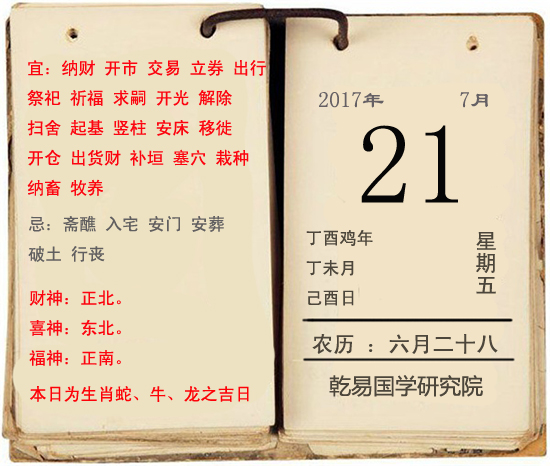 一、时间:公历:2017年7月21日;农历:【鸡年】六月二十八;岁次:丁酉鸡年 丁未月 己酉日。