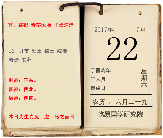 一、时间:公历:2017年7月22日;农历:【鸡年】六月二十九;岁次:丁酉鸡年 丁未月 庚戌日。