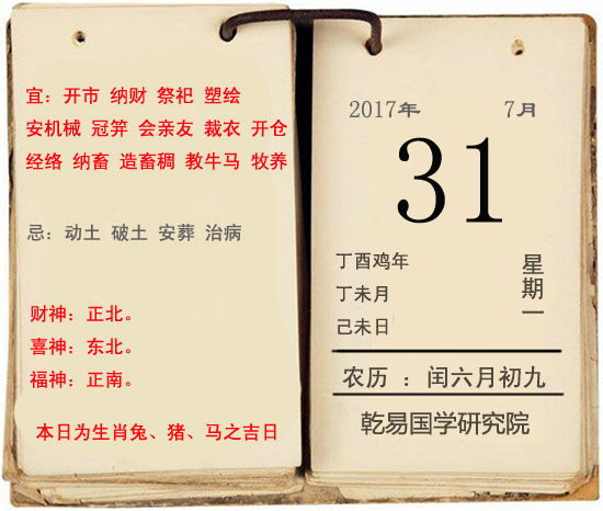 一、时间:公历:2017年7月31日;农历:【鸡年】闰六月初九;岁次:丁酉鸡年 丁未月 己未日。