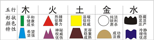 (五行与颜色、形状、特性的对应关系图。)