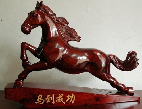 (午马。木雕的红色奔马。木雕为木五行,马为午火,红色为火;所以用红木、桃木、檀木、花犁木等上好木材雕刻的红马,在五行上木火相生,具有很强的午火能量。如果能摆放在南方午火位,更能使午火的力量倍增。正确地使用这一风水吉祥物,可以对事业、财运起到非常大的旺运效果。)