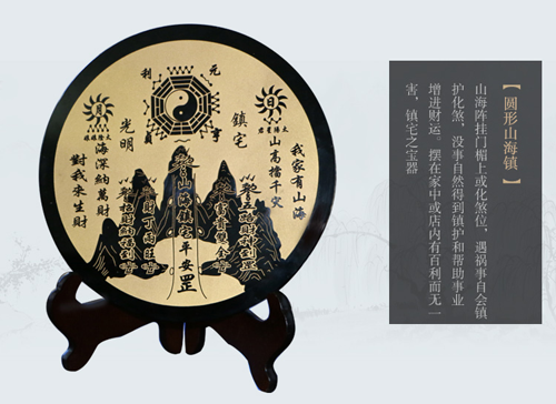 如:“山海镇风水盘”具有移山排海,将煞气完全排除,颠倒阴阳之功效。正中央画八卦太极图,南北各安日与月,中间画三山五岳,四周是五湖四海。所以在风水化煞上应用非常广泛,面对各种形式煞都有化煞效果。