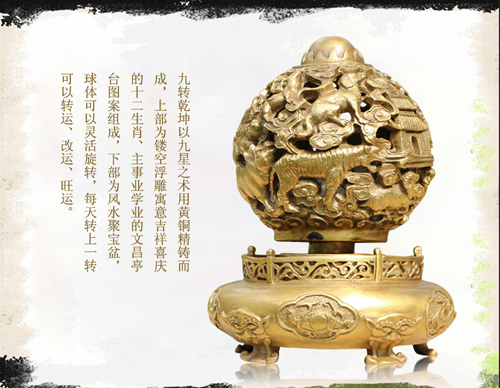 如:“转运炉”运用了大量的周易学原理,设计考究,做工精湛,材质高贵。市场上现有的产品,往往只是简单的使用八卦、太极等图案,自然效果一般。“乾易一号店”的“转运炉”是目前最具功效的堪舆产品。具有改运旺运、招财、辟邪、祛病强身、辅助修行的作用。