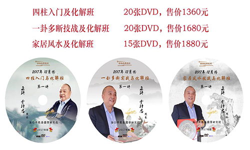 好消息!好消息!大家期盼已久的2017年12月份李计忠大师“四柱入门及化解班”、“一卦多断技法及化解班”与“家居风水技战及化解班”光盘终于面向社会发行了。为了让那些因各种客观原因,未能在课堂上亲耳聆听李大师精彩绝伦授课内容的朋友们不留遗憾,我院决定,本次面授班光碟面向社会发售。