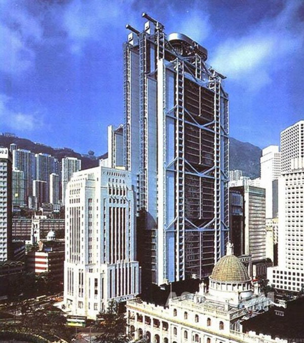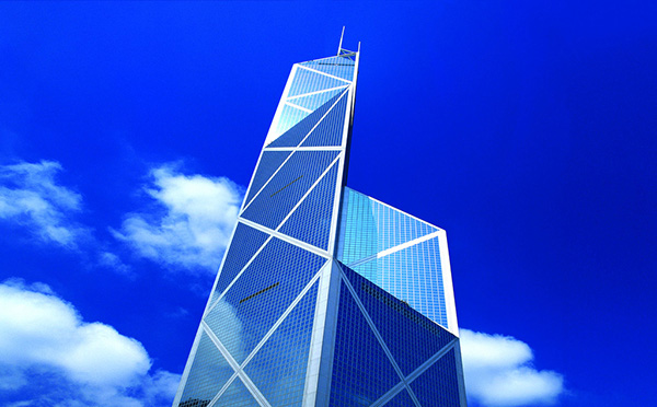 香港的建房更是讲风水的,重大建筑工程都要请风水大师们指点一番。中行进入香港前,汇丰银行在香港效益非常好,就在其业绩如日中天之时,中行闯进香港,在其边儿上建起了中银大厦。香港中国银行大厦位于香港中西区花园道与金钟道交界处。总建筑面积层,总高367.4米(其中建筑高度315.4米,顶层天线高度52米)。大厦平面为边长52米的正方形,对角线分成的4个三角形各不相同,楼顶倾斜,整个建筑像一个富有变化的多面体。大厦外形呈三角几何形状,就好象一个一个蓝色的水晶叠在一起,贝聿铭的“三角式”特色,犹如一把钢刀直指汇丰银行。贝聿铭充满诗意地把大楼比喻成充满希望的春笋,寓意中国银行节节上升。
