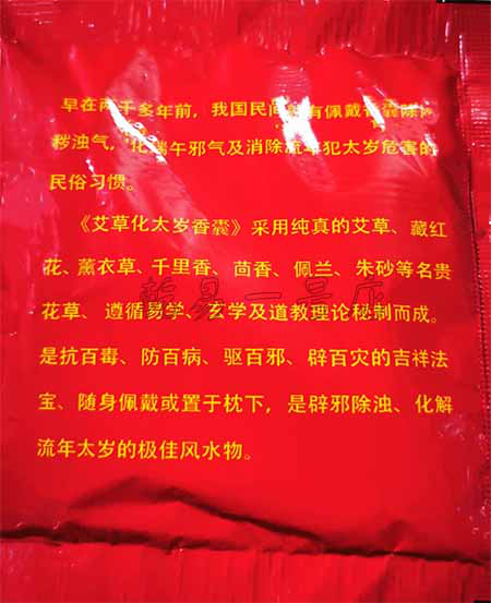 早在两千多年前,民间就有佩戴香囊除年秽浊气,消除流年犯太岁危害的民俗习惯。【艾草化太岁香囊】采用纯正的艾草、藏红花、薰衣草、千里香、茴香、佩兰、朱砂等名贵花草,遵循易学、玄学及道教理论秘制而成,是抗百毒、防百病、驱百邪、辟百灾的吉祥法宝。随身佩戴或置于枕下,是辟邪除浊、化解流年太岁的极佳风水物。