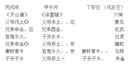 分析:2000年太岁庚辰,太岁入初爻发动化子孙子水,子孙为财钱的路,父母辰土为项目,逢太岁是辰土,与世爻午火不能构成三合火局了,该年太岁耗身,化出子孙子水冲克午火世爻,为投资不对路,该年辛苦,财运一般。