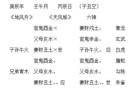 因应爻丑土旬上空,与上六酉金空合,酉动化戌,丑戌相穿,酉动受月令之克,火金主神经系统,上六主头,当然是脑神经系统有毛病。变卦为《姤》乾金冲克巽木,三爻官鬼酉金化官鬼酉金临螣蛇,此为鬼化鬼为不祥之兆。如鬼临空墓绝胎囚之地,加蛇虎多为刀刃车马之伤亡。鬼化鬼必有两姓,女是亡夫再嫁之命。因应爻丑土代表妹妹,初爻与三爻是同宫,所以三爻之官可取为妹夫。故断,其妹是因丈夫出现意外的伤亡而引起脑神经有病。