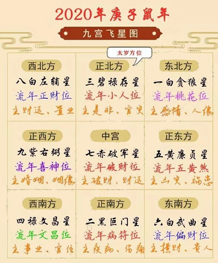 2020年九紫右弼星飞临兑宫正西方,九紫右弼星是喜庆星,性最燥烈,宜吉不宜凶,吉者遇之立刻发福生旺,凶者值之勃然大祸,在八运为吉星,主喜庆盈门、大利置业,所求之事能心想事成,布置得宜的话,主吉祥喜庆,家人事业顺利,升迁有望,广发财源,成就耀眼。还能带来良好的人缘,招贵人上门,在婚姻及感情上,能促成好事,旺桃花姻缘,添丁添福,旺财旺人丁。