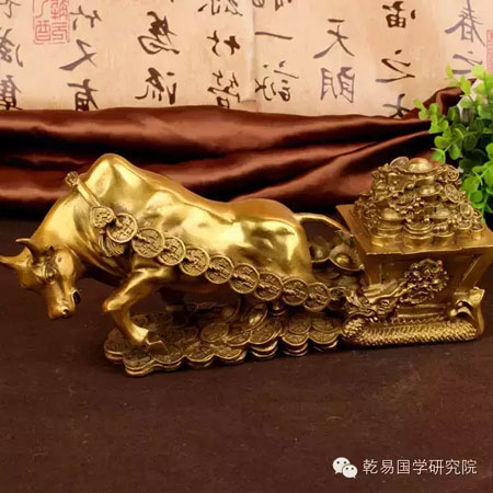 此款牛拉金银财宝,意味着老牛拉财往家奔,牛车之上的金银珠宝象征着财源广财、财运旺,对于做生意,搞经营、想求偏财的人来说,有着莫大的助益。不管是在家里还是在办公室,摆放铜牛,能够给自己带来牛运气。2016猴年必备招财吉祥物之二。